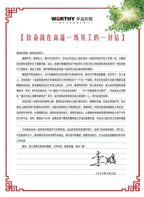 8月9日-10日,總經(jīng)辦副主任胡麗娜代表集團總裁李鵬先生先后前往物業(yè)公司秩序部、物業(yè)公司工程部,地產(chǎn)公司工程板塊進行慰問,為奮戰(zhàn)在高溫一線的同事們送去防暑降溫藥品及清涼飲品。胡主任代李總向大家轉(zhuǎn)達囑托,并感謝奮戰(zhàn)在高溫一線崗位同仁的堅守,叮囑大家在努力工作的同時一定注意防暑降溫和身體健康。李總特百忙之中擬信一封,向大家表示衷心的感謝和深切慰問!