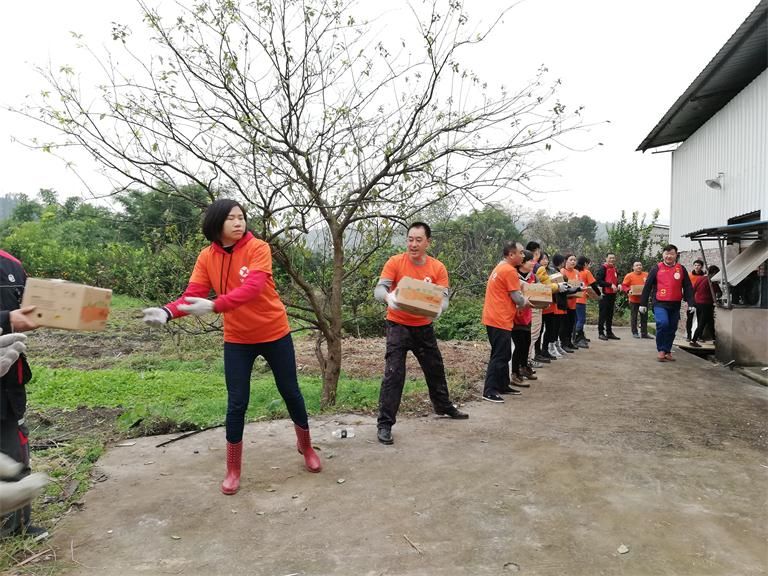 上圖:集團志愿者將包裝好的廣柑接力裝到物流車上
