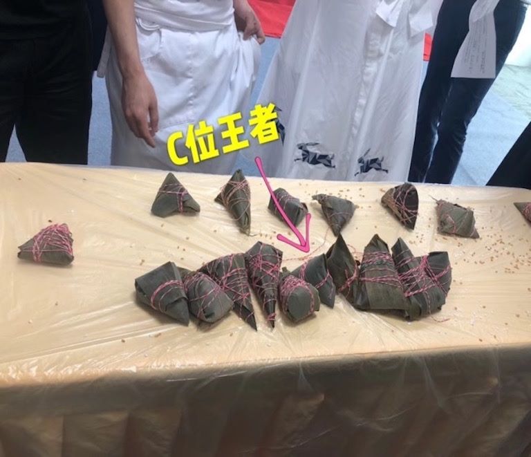 比賽開(kāi)始后,大家紛紛圍在一起動(dòng)起手來(lái),一時(shí)間粽葉舞動(dòng),麻繩穿梭。大多數(shù)客戶因?yàn)闆](méi)有經(jīng)驗(yàn),繩子還沒(méi)來(lái)得及捆,粽子葉就散了,糯米灑了一桌,但大家都有一種不放棄的精神,不斷的相互交流向中廚請(qǐng)教。幾分鐘后,各種奇形怪狀的粽子開(kāi)始成形,有三角形、菱形、長(zhǎng)條形的粽子頗有特色。
