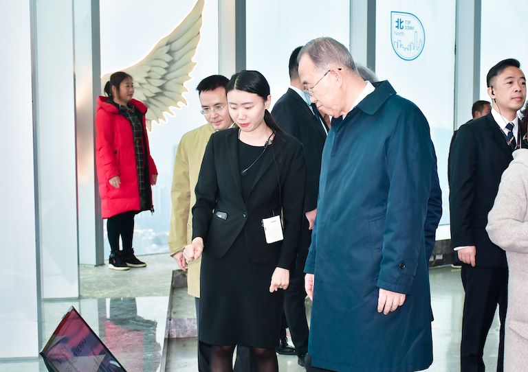 【華迅地產(chǎn)/總經(jīng)辦】12月1日,博鰲亞洲論壇理事長、聯(lián)合國第八任秘書長潘基文攜夫人柳淳澤、聯(lián)合國前副秘書長金垣洙、韓國前駐聯(lián)合國大使金塾在渝中區(qū)區(qū)委常委、區(qū)政府常務(wù)副區(qū)長王勇的陪同下一道蒞臨重慶環(huán)球金融中心(以下簡稱WFC)會仙樓觀景臺參觀考察,華迅控股集團(tuán)總裁李鵬、租售部營銷總監(jiān)高瑜、觀景臺副總楊晉陪同參觀,并對潘基文先生一行的到來表示熱烈歡迎。